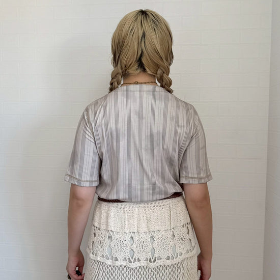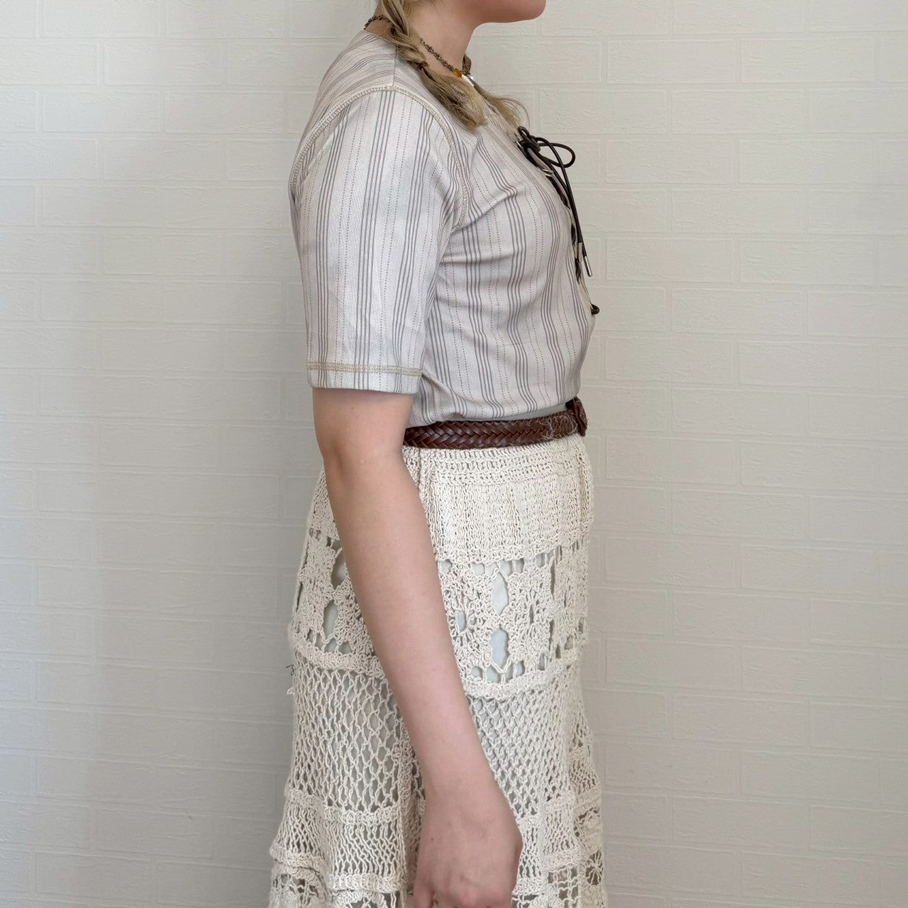 2コーデ目は巻きスカートを胸のところで結んでビスチェ風にアレンジしたレトロカジュアルコーデ、インナーとしての役割も◎