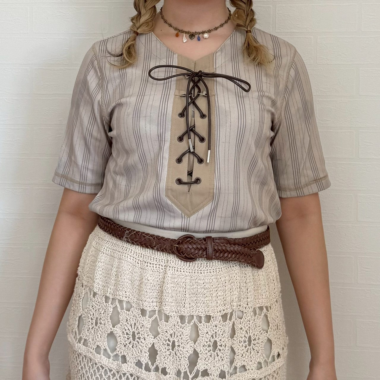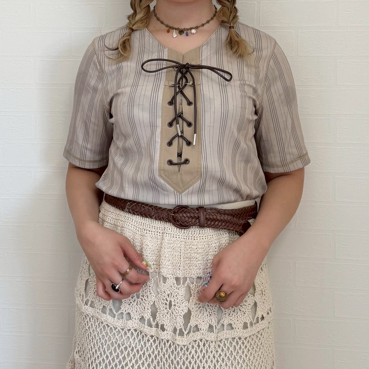 レザー素材の紐でレースアップデザインになっており、リボンにするのはもちろん垂らして着るのも◎
