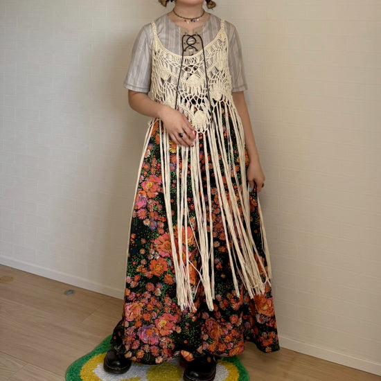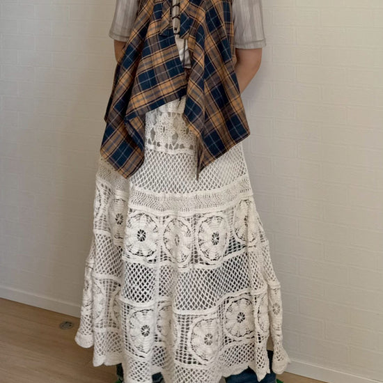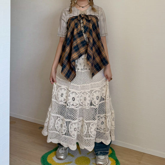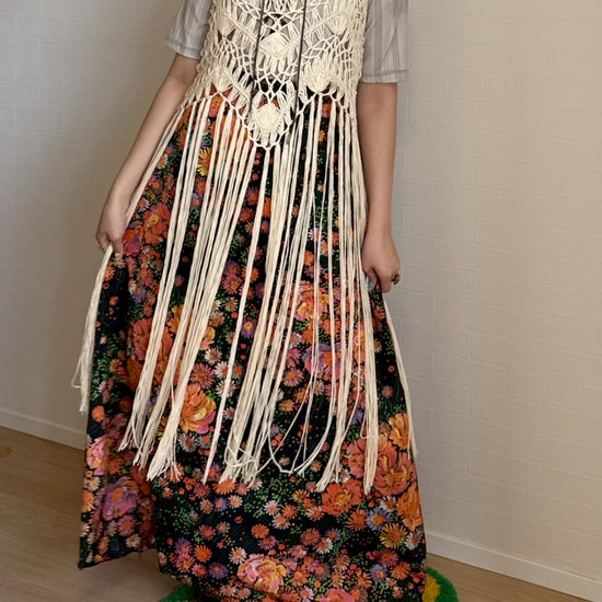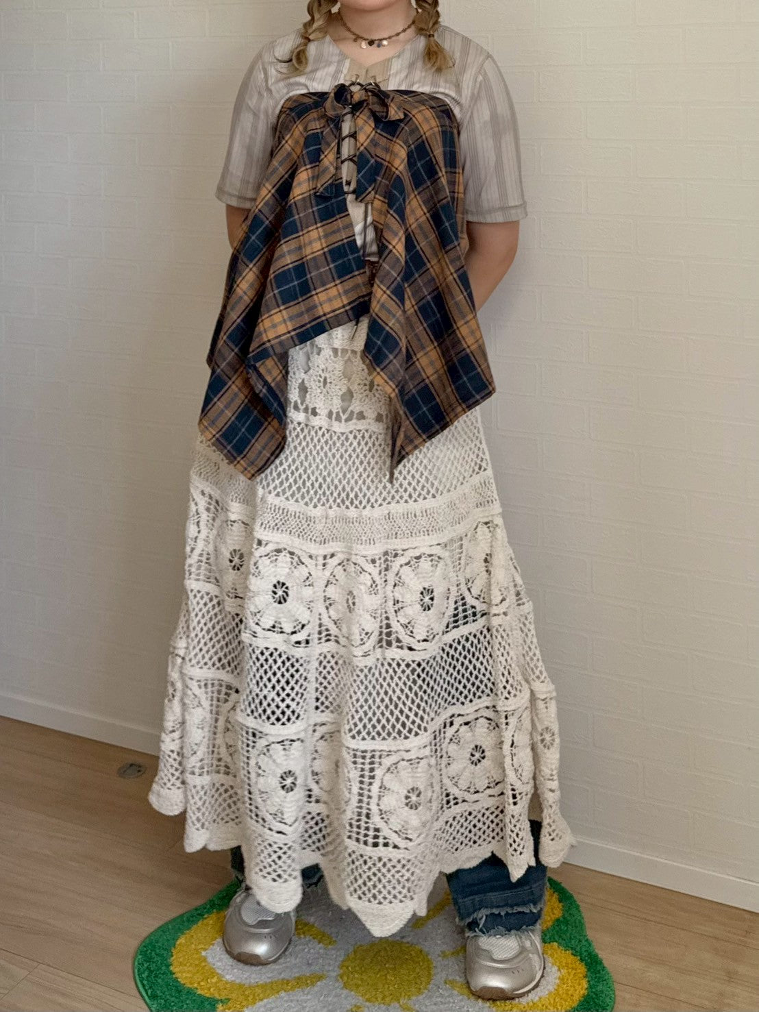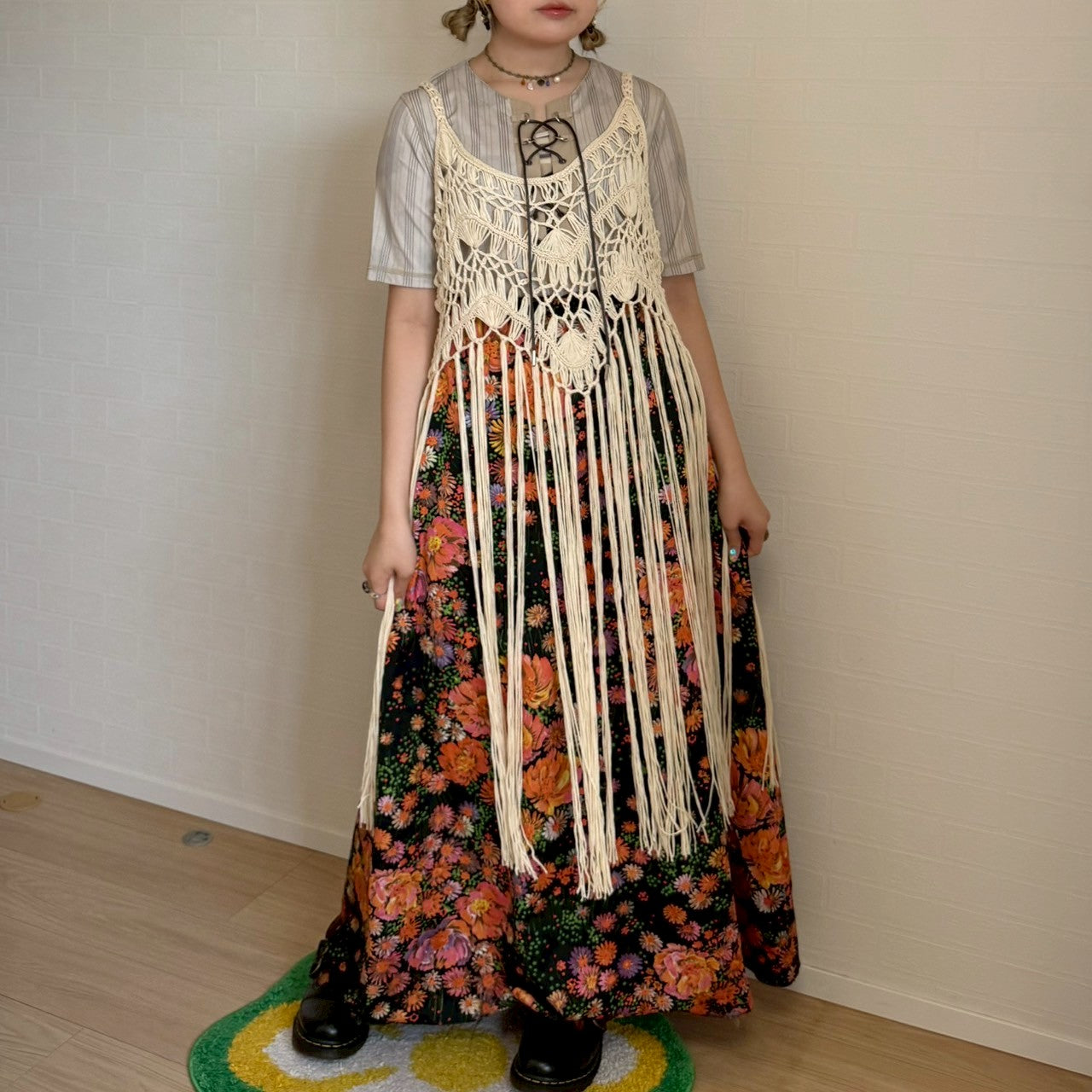 1コーデ目はエスニックキャミワンピースとAライン柄スカートを合わせたエスニックコーデ、丸襟なのでネックレスが映えます🌺