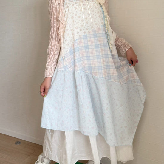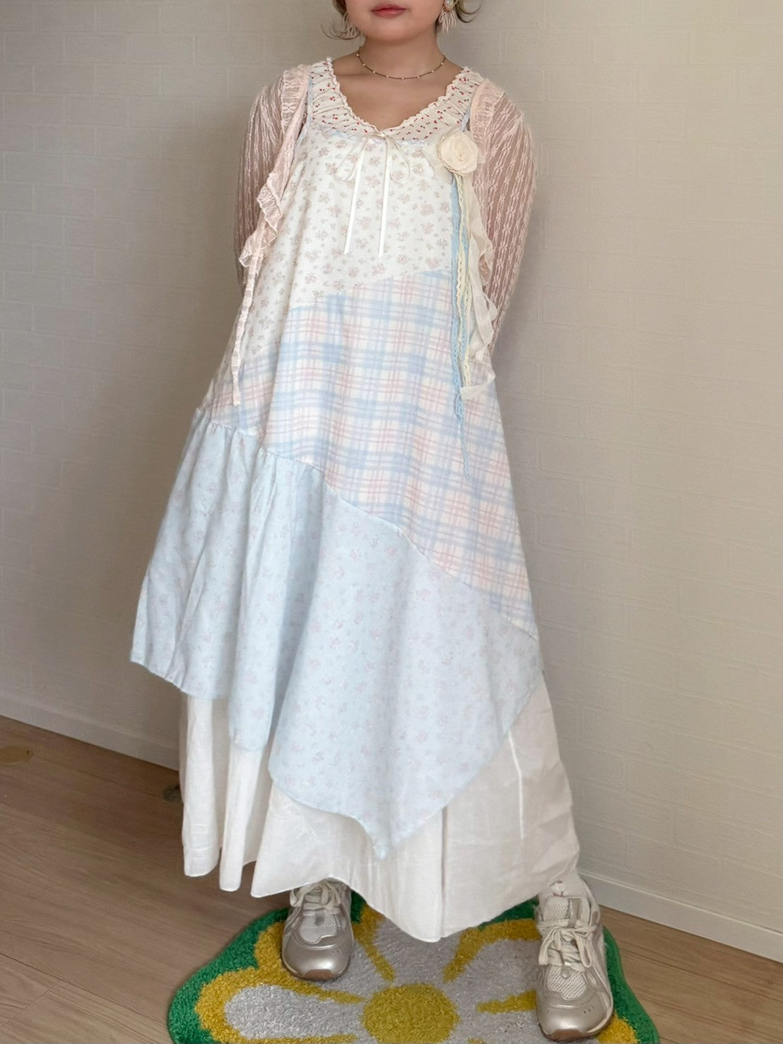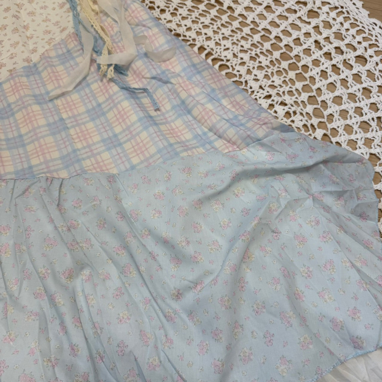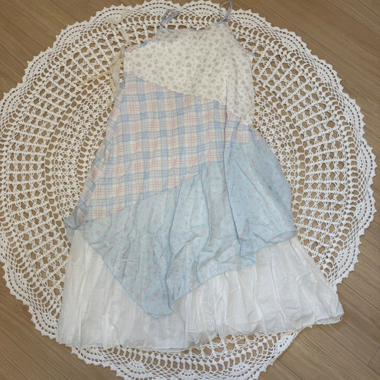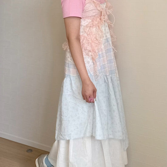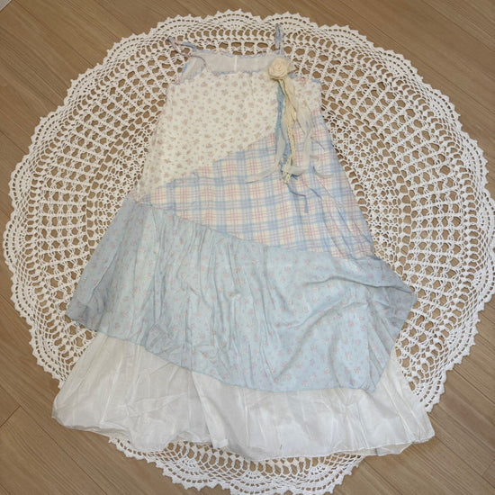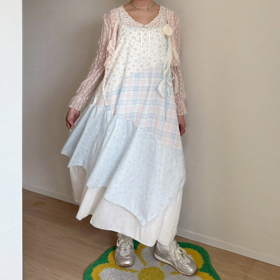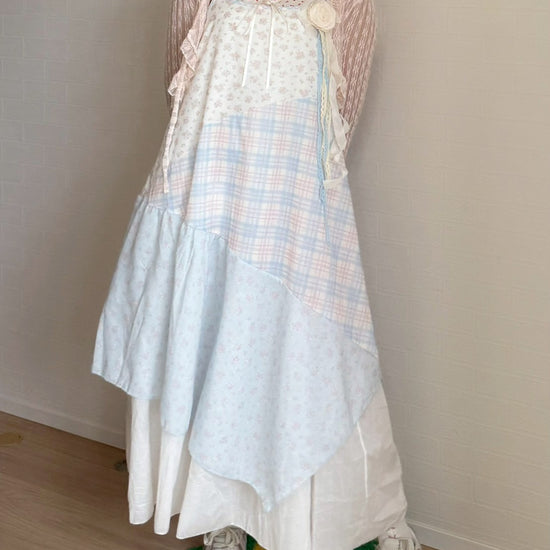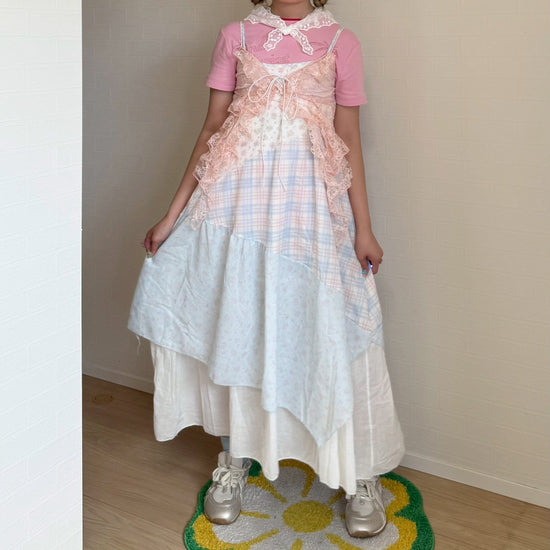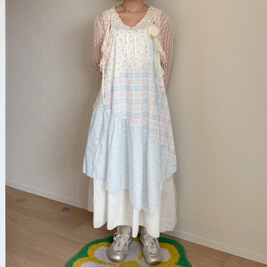 ピンクと水色のパステルカラーで統一されたパッチワークキャミワンピースです🐬🌷