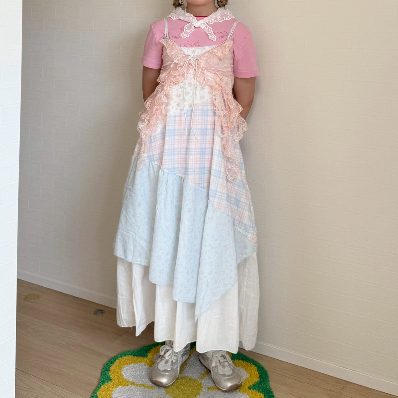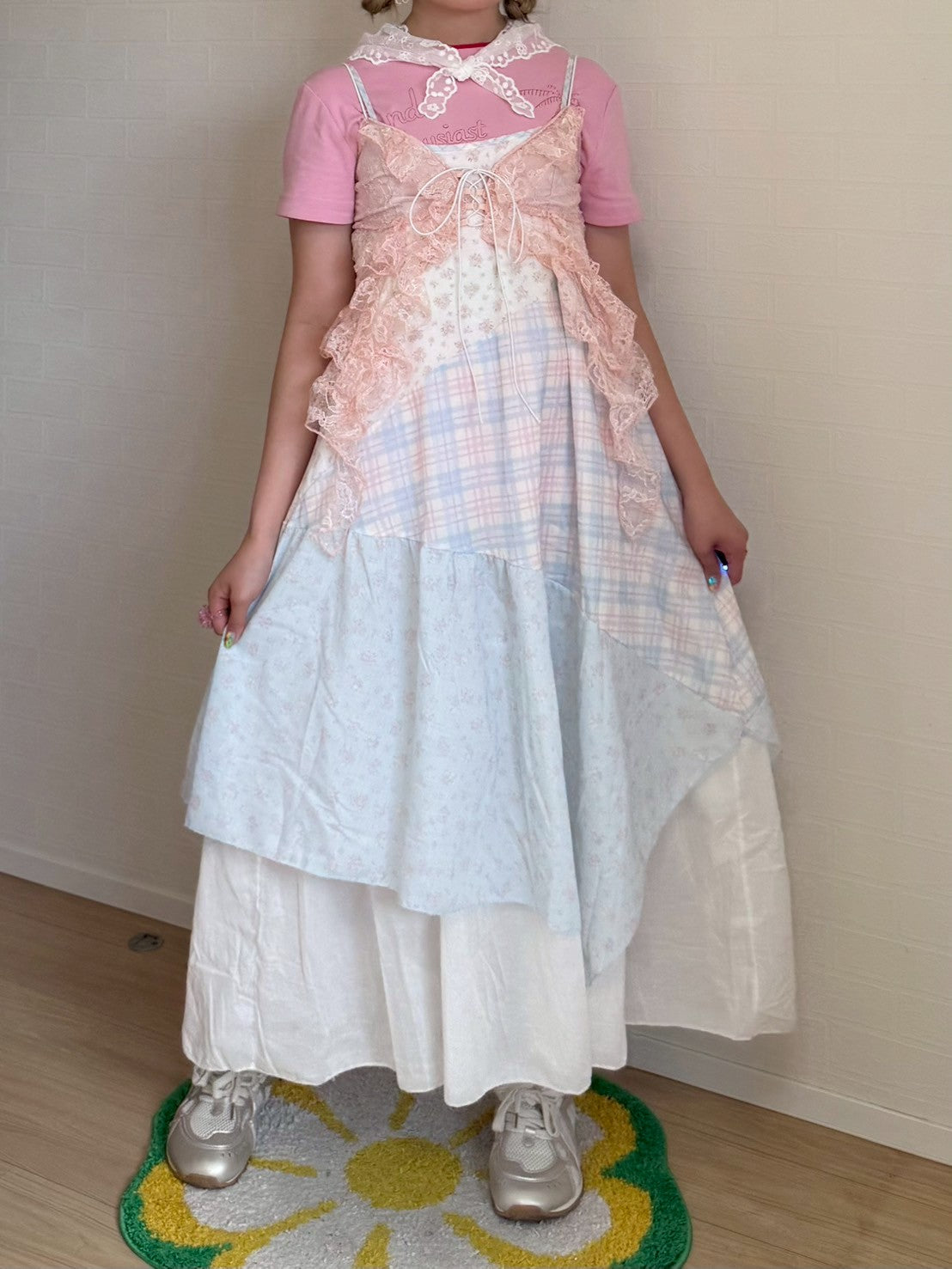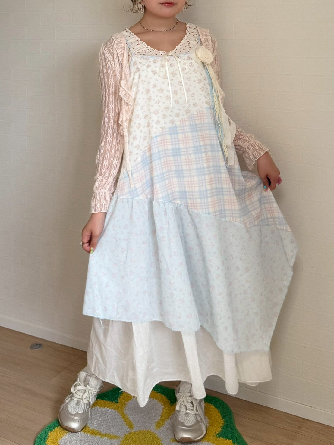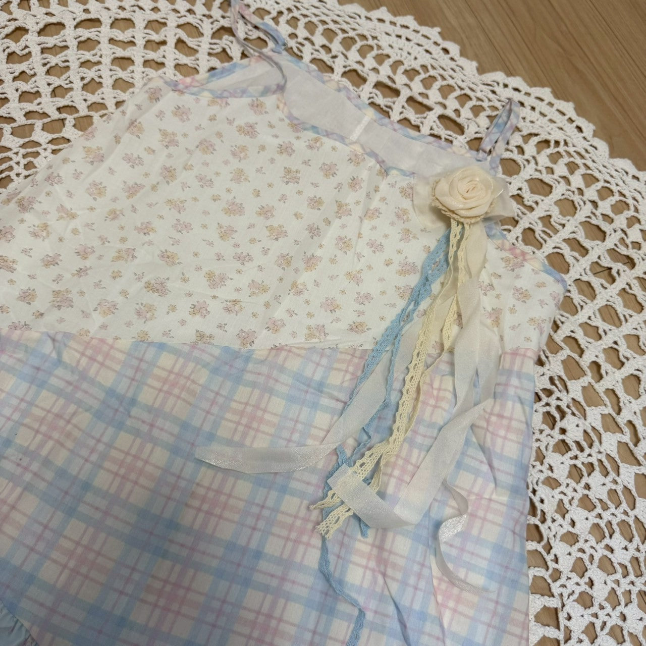 ピンクと水色のパステルカラーで統一されたパッチワークキャミワンピースです🐬🌷