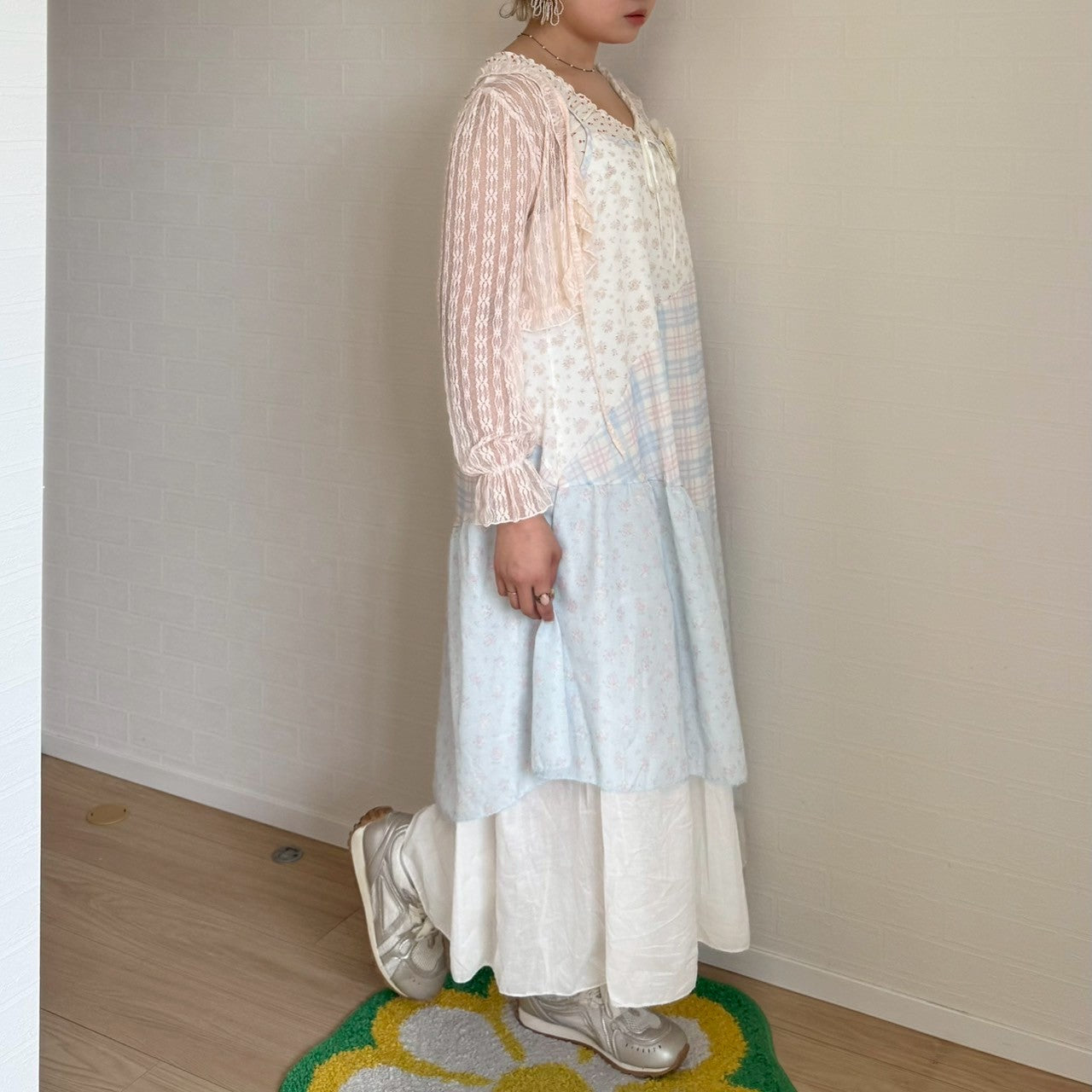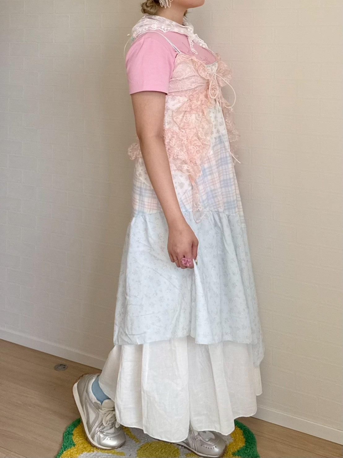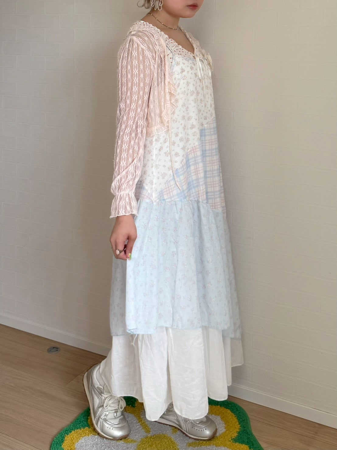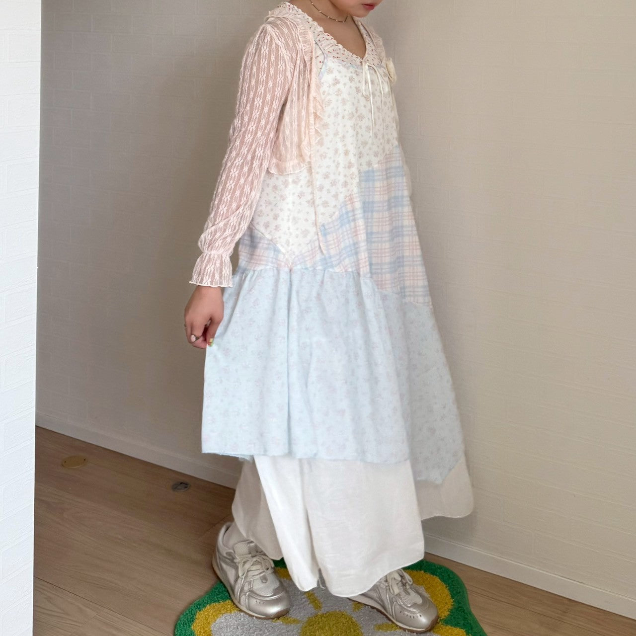 ピンクと水色のパステルカラーで統一されたパッチワークキャミワンピースです🐬🌷
