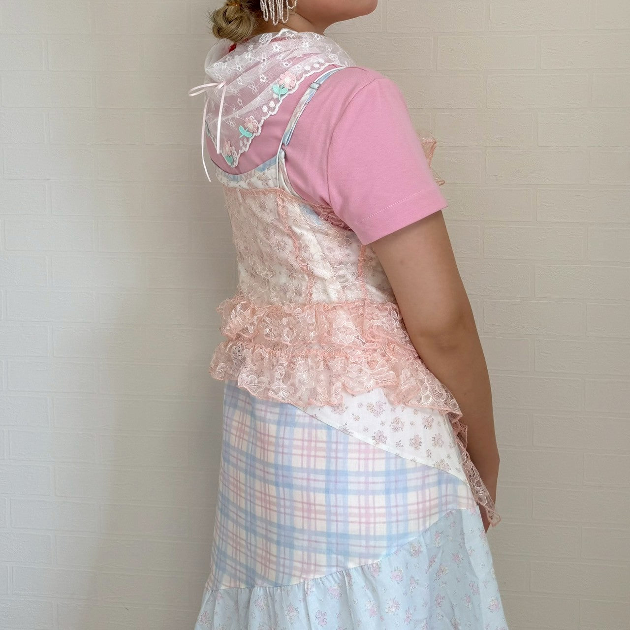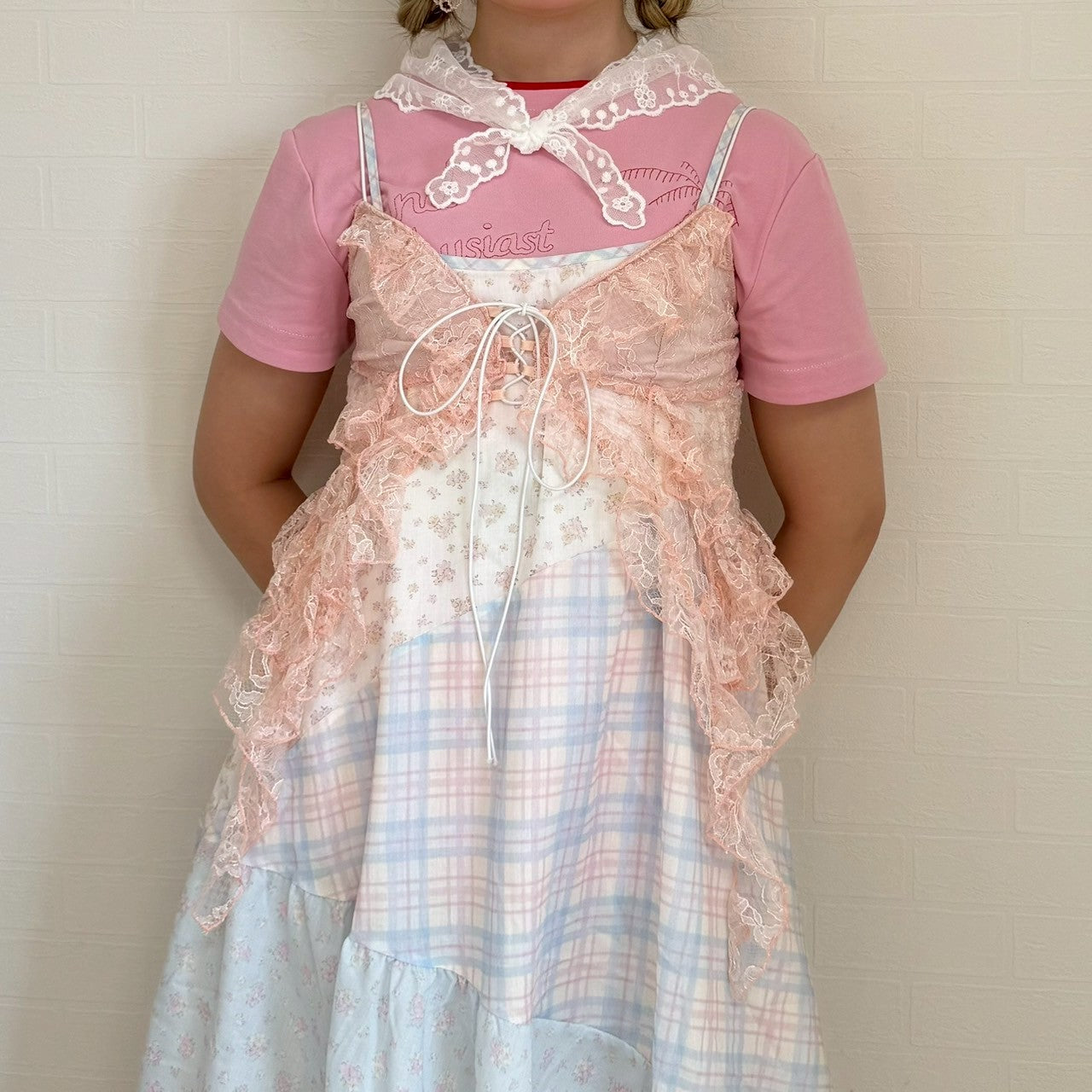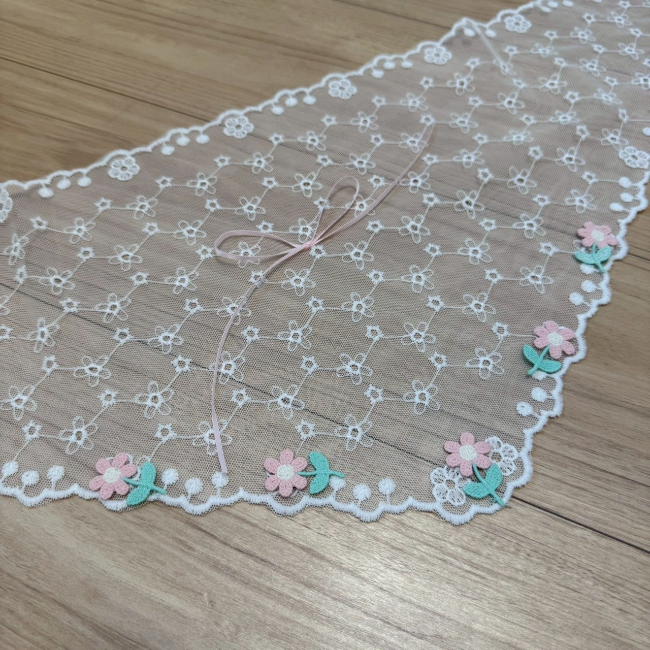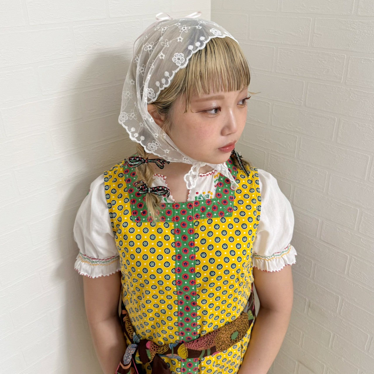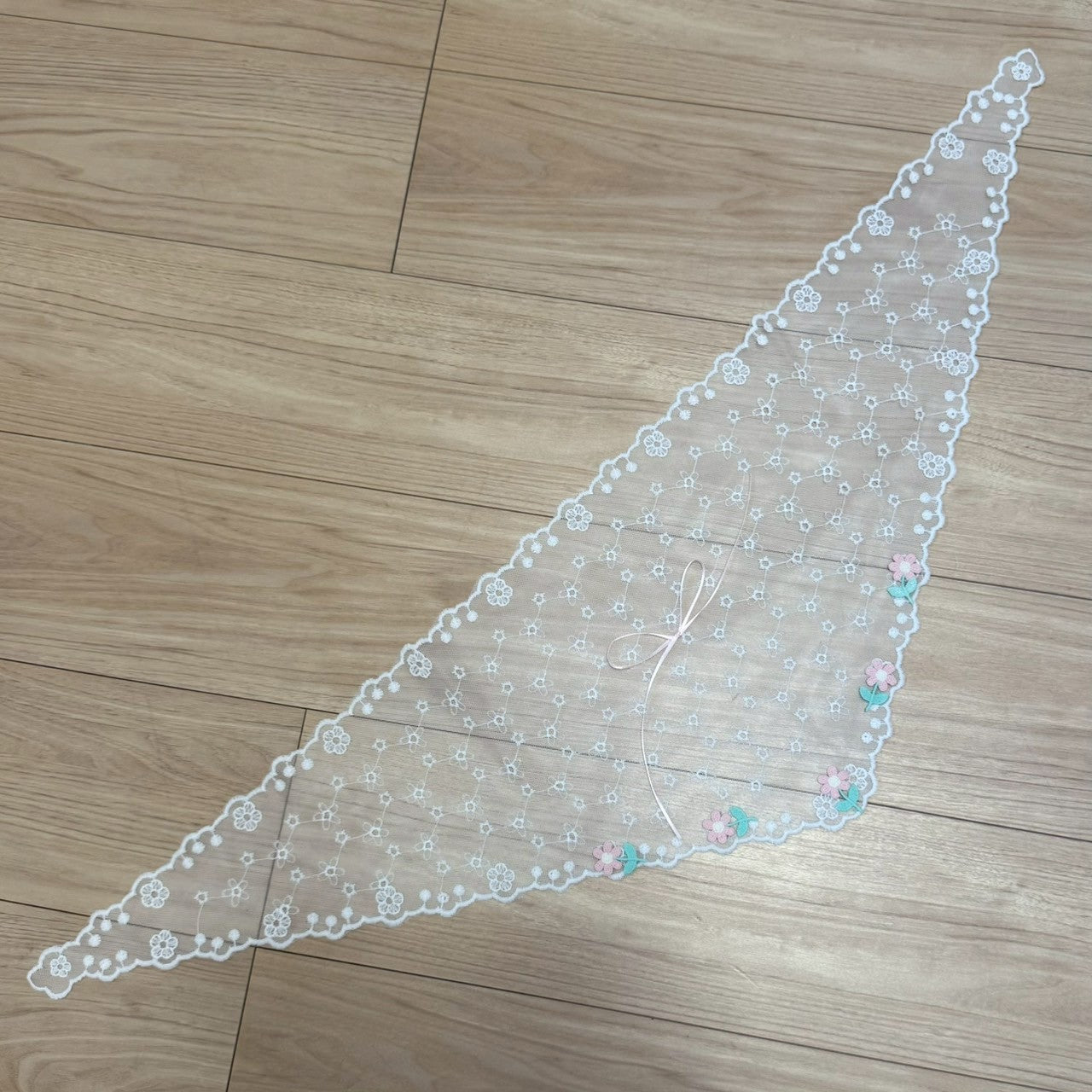 夏らしいレース素材にお花の刺繍やピンクの大きいリボンがかわいいヘッドスカーフです🎀