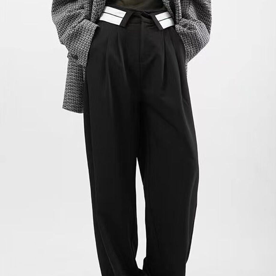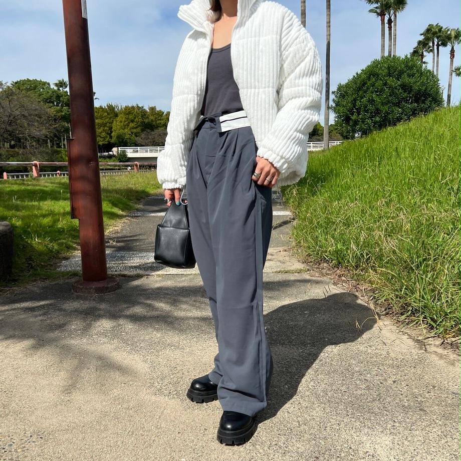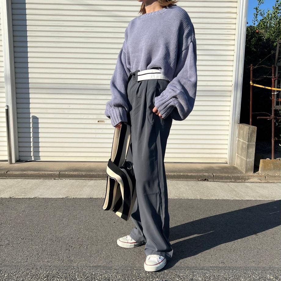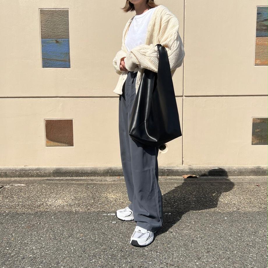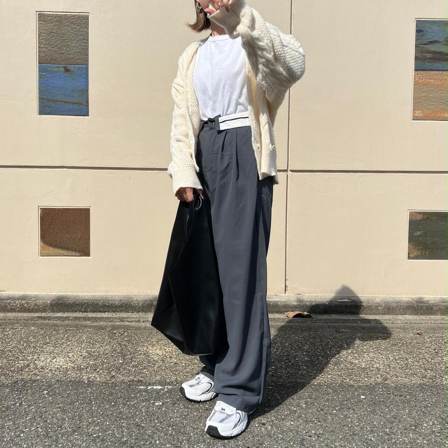 定番化しているゆったり目のスラックスデザイン。