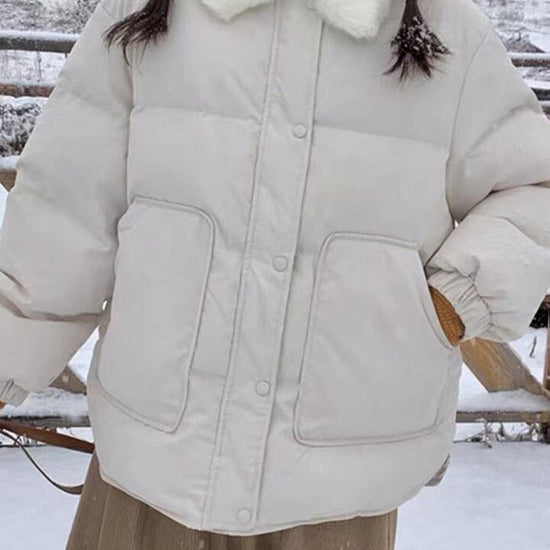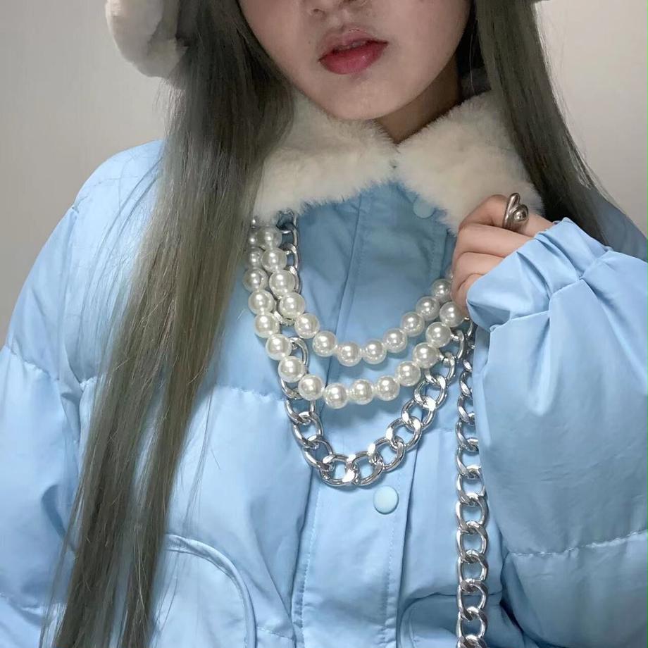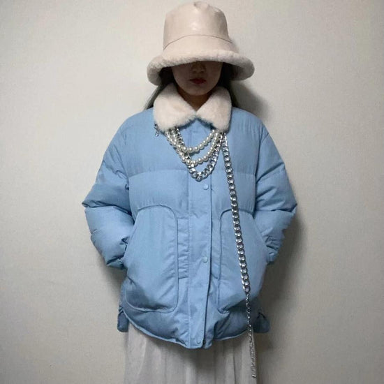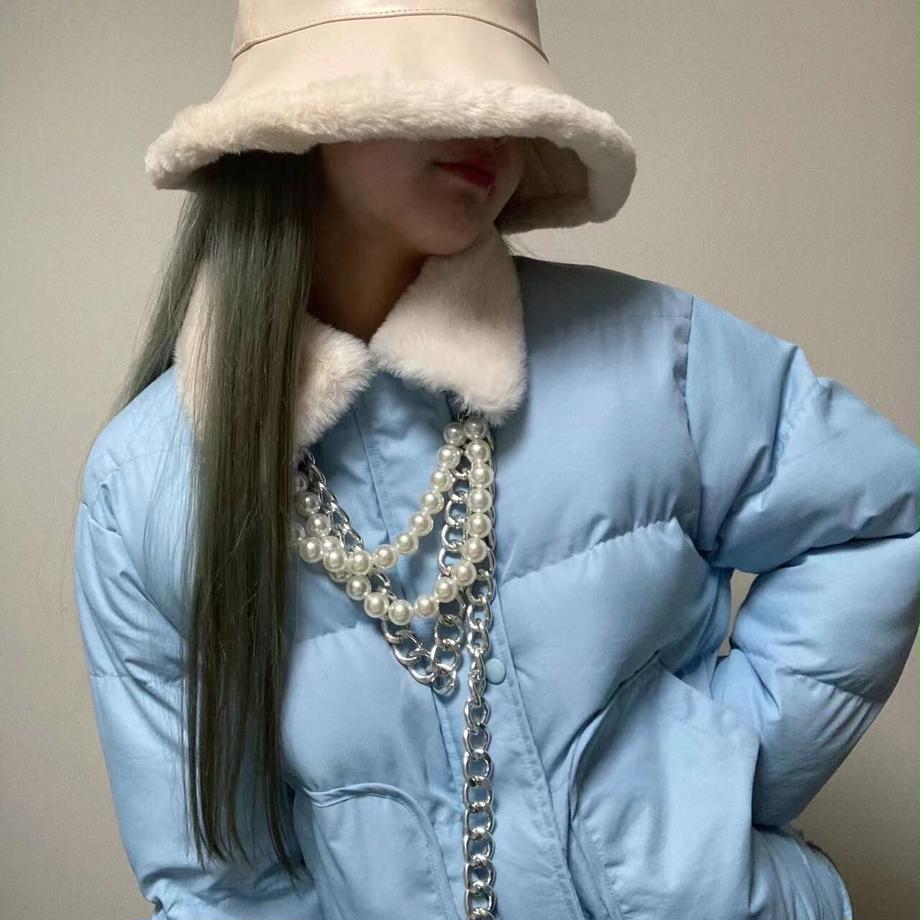 冬に欠かせないダウンジャケット。アイスブルーは綺麗な冬の季節にぴったり。ファーの襟で顔を明るく見せてくれます。